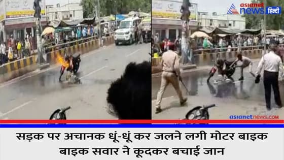 सड़क पर अचानक धूं-धूं कर जलने लगी मोटर बाइक, चालक ने कूदकर बचाई जान