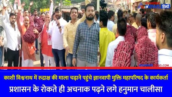 वाराणसी: उत्तर प्रदेश की धर्मनगरी काशी में ज्ञानवापी मुक्ति महापरिषद के कार्यकर्ता मंगलवार की सुबह श्रीकाशी विश्वनाथ व भगवान नंदी को 51 किलो की रुद्राक्ष की माला चढ़ाने के लिए जा रहे थे। जिन्हें सुरक्षा कारणों के चलते पुलिस प्रशासन ने रोक दिया। इससे गुस्साए कार्यकर्ताओं ने जमीन पर ही बैठकर हनुमान चालिसा का पाठ शुरू कर दिया। कार्यकर्ताओं और पुलिस में काफी देर तक मंदिर जाने को लेकर बहस होती रही। अंत में पुलिस ने कार्यकर्ताओं को रुद्राक्ष की माला चढ़ाने की अनुमति दे दी।