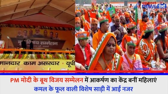 PM मोदी के बूथ विजय सम्मेलन में आकर्षण का केंद्र बनीं महिलाएं, कमल के फूल वाली विशेष साड़ी में आईं नजर