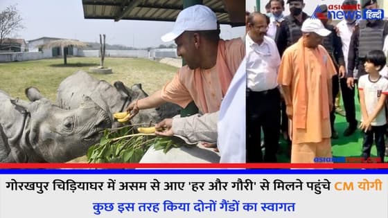 गोरखपुर चिड़ियाघर में आए 'हर और गौरी' से मिलने पहुंचे योगी आदित्यनाथ, कुछ इस तरह किया दोनों गैंडों का स्वागत