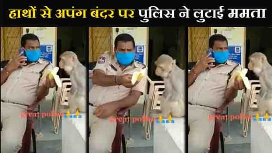 वीडियो: बंदर के नहीं है दोनों हाथ, पुलिसवाले ने अपने हाथों से छीलकर खिलाया केला