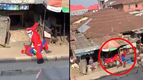 वीडियो डेस्क। सोशल मीडिया पर एक मजेदार वीडियो वायरल हो रहा है। वीडियो नाइजीरिया का है जहां सड़क पर सैंटा क्लॉज और स्पाइडर में आपस में लड़ते हुए दिखाई दे रहे हैं। मजेदार बात ये है कि स्पाइडर मैन पर सेंटा क्लॉस भारी पड़ गया और हवा में उड़ते हुए जोरदार टक्कर मारी। ये वीडियो तेजी से वायरल हो रहा है। आप भी देखिए मजेदार वीडियो।