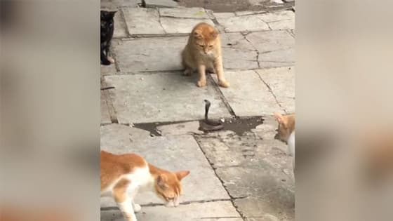 बिल्लियां इस सांप को घेरकर बैठी नजर आ रही हैं। सभी बारी-बारी से सांप को छेड़ती नजर आ रही है। बेचारा सांप उनके बीच से निकलने की कोशिश करता रहता है।