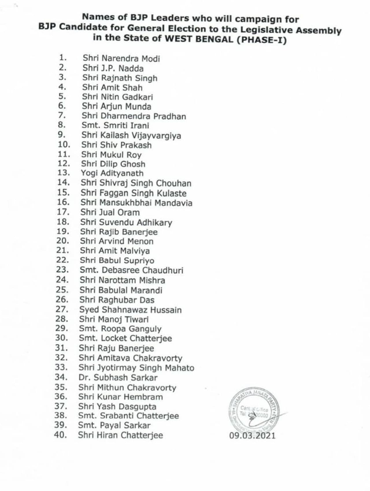 संसद भवन में बुधवार को हुई भाजपा की संसदीय दल की बैठक में प्रधानमंत्री नरेंद्र मोदी ने भरोसा जताया कि इस बार बंगाल चुनाव जीतेंगे। मोदी ने नेताओं को नसीहत दी कि जिनकी ड्यूटी पांच राज्यों में हो रहे विधानसभा चुनाव में लगी है, वे ठीक से अपनी जिम्मेदारी निभाएं। इस बीच पार्टी ने बंगाल चुनाव के लिए 40 स्टार प्रचारकों की लिस्ट जारी की है।