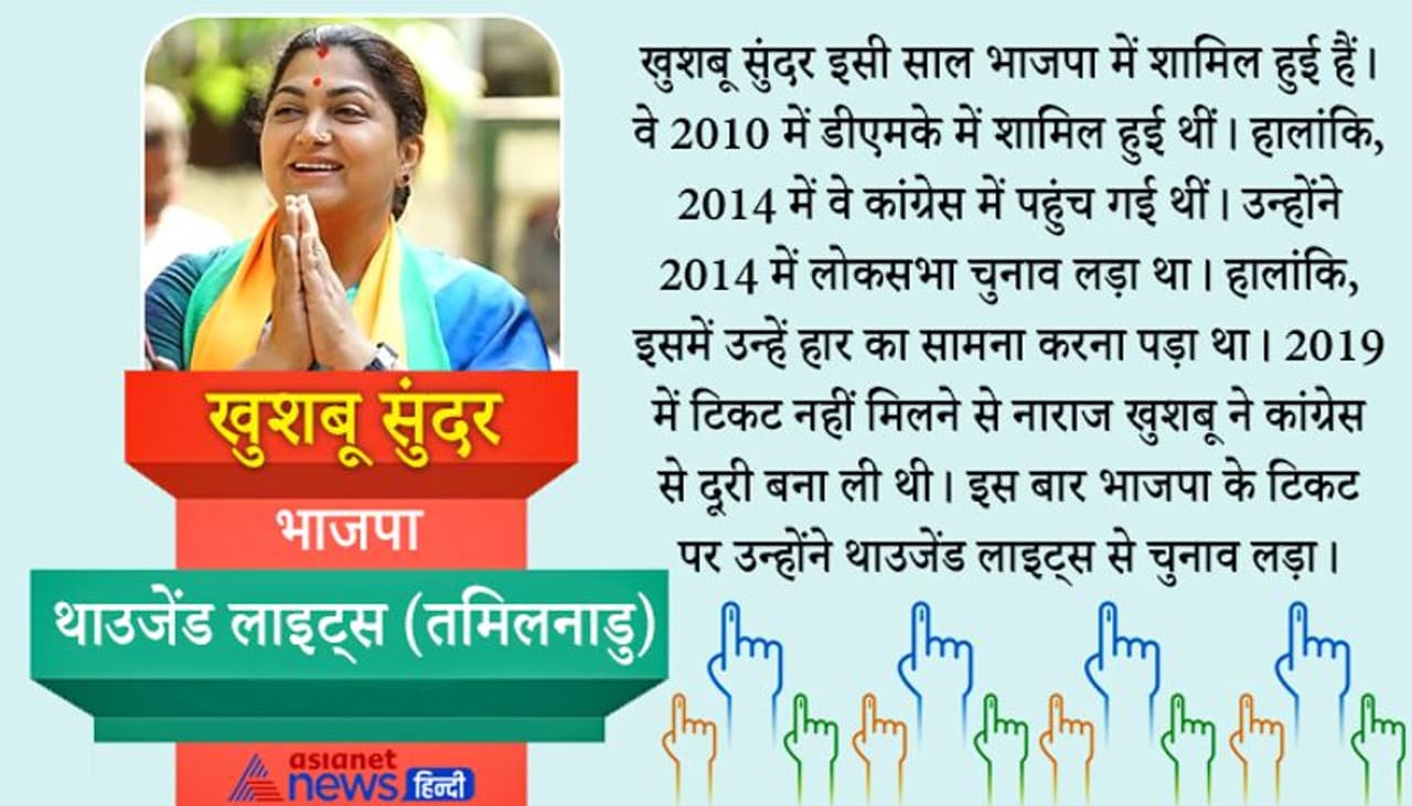 खुशबू सुंदर इसी साल भाजपा में शामिल हुई हैं। वे 2010 में डीएमके में शामिल हुई थीं। हालांकि, 2014 में वे कांग्रेस में पहुंच गई थीं। उन्होंने 2014 में लोकसभा चुनाव लड़ा था। हालांकि, इसमें उन्हें हार का सामना करना पड़ा था। 2019 में टिकट नहीं मिलने से नाराज खुशबू ने कांग्रेस से दूरी बना ली थी। इस बार भाजपा के टिकट पर वे थाउजेंड लाइट्स से चुनाव लड़ रही हैं।