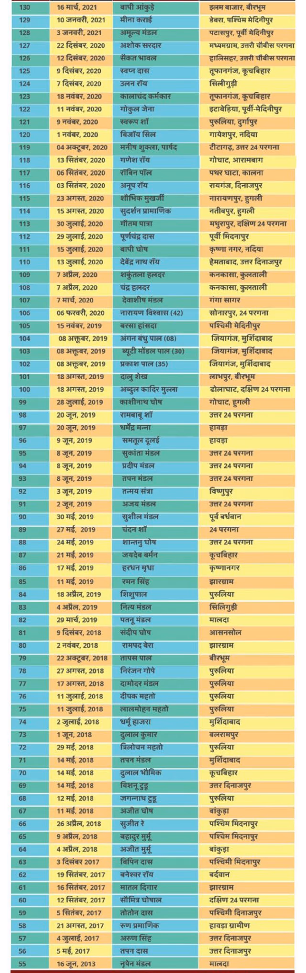 पिछले दिनों केंद्रीय गृहमंत्री अमित शाह ने दावा किया था कि बंगाल में पिछले कुछ सालों में 130 भाजपा कार्यकर्ताओं की हत्या की गई। अगर बंगाल में भाजपा सरकार में आती है, तो आरोपियों को जेल भेजेगी। यह इस लिस्ट में 55 कार्यकर्ताओं के नाम उपलब्ध नहीं हैं।