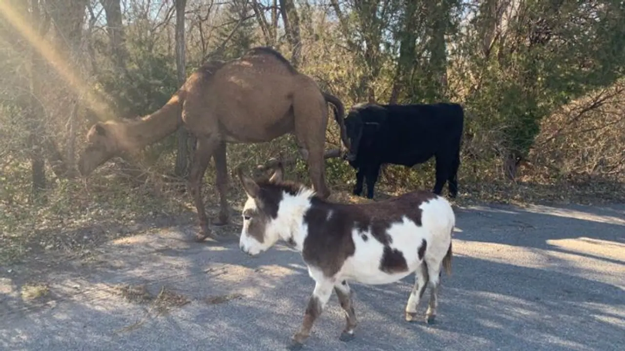 अमेरिका के कन्सास में एक सड़क पर ऊंट, गाय और गधा एक साथ मिलने की तस्वीर सोशल मीडिया पर काफी वायरल हो रही है। इसे लेकर लोग तमाम प्रकार के सवाल भी कर रहे हैं।