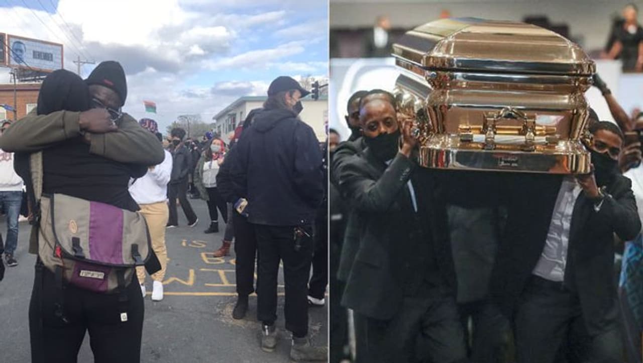 (जॉर्ज को लेकर अमेरिका में इस तरह का माहौल हो गया था, दूसरे चित्र में जॉर्ज को दफनाने ले जाते हुए)