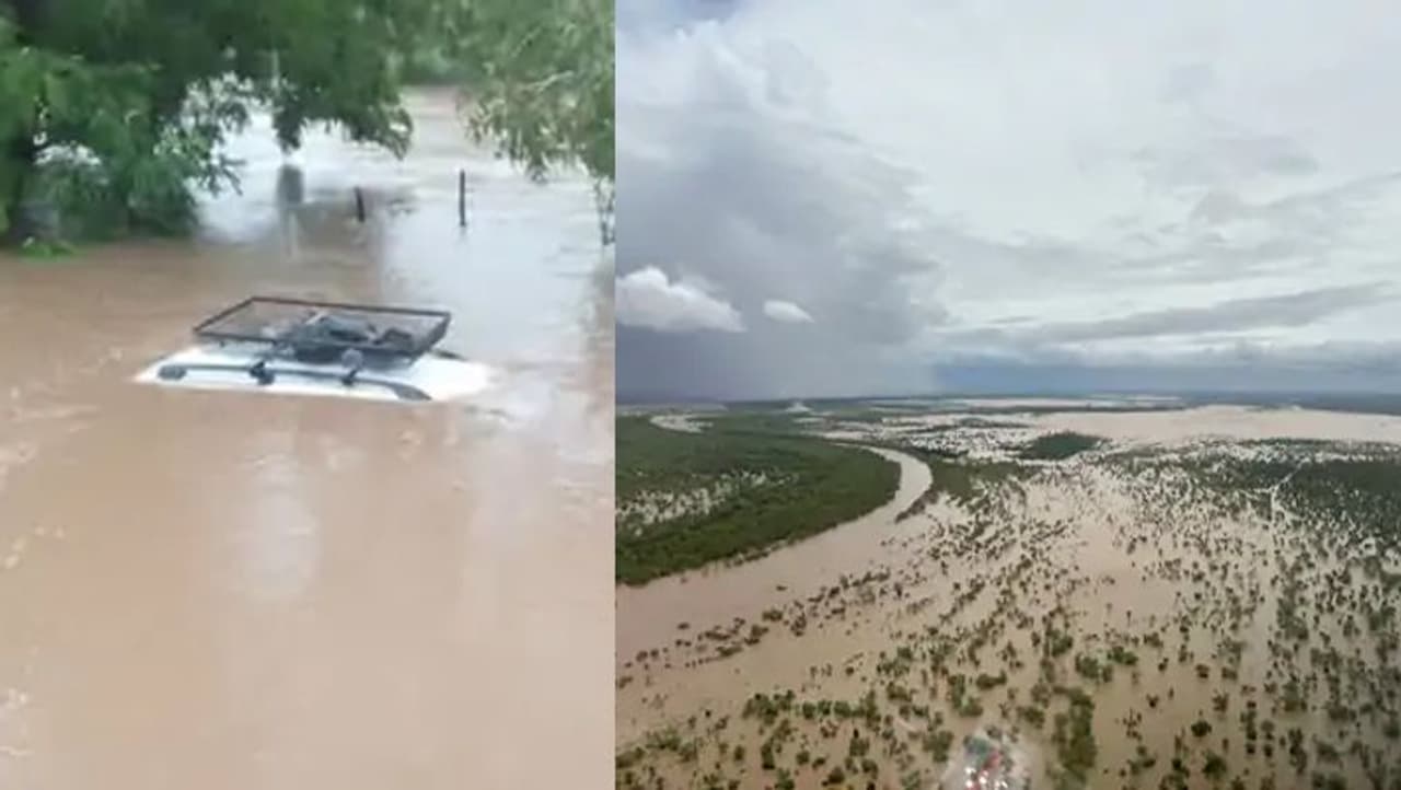 ऑस्ट्रेलिया के किंबरली इलाके में ट्रॉपिकल साइक्लोन ऐली की वजह से भारी बारिश हुई है, जिसके चलते यहां के ज्यादातर इलाके चारों तरफ पानी से घिर गए हैं। सड़कें पानी में डूब गई हैं। बाढ़ के चलते इस इलाके में बड़ी संख्या में कंगारू भी फंस गए हैं।