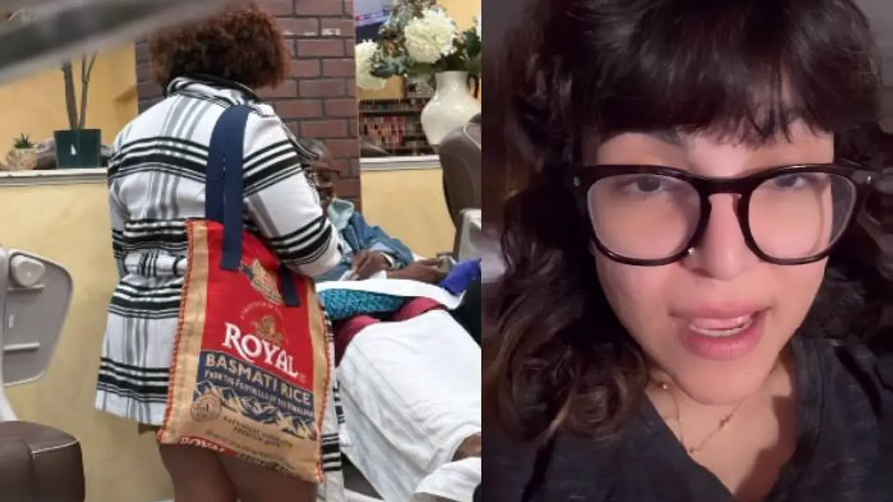 इंस्टाग्राम यूजर अमांडा जॉन मंगलथ ने यह तस्वीर सोशल मीडिया पर शेयर की है। इसमें एक महिला बासमती चावल का बोरा लिए सलून में खड़ी है। महिला काफ़ी मॉडर्न लुक में है।