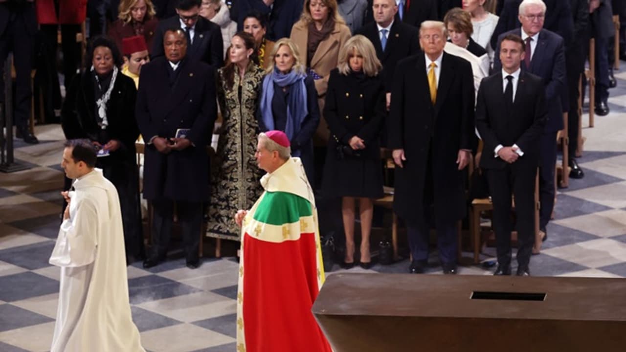 फ्रांस के राष्ट्रपति इमैनुएल मैक्रॉन ने डोनाल्ड ट्रम्प सहित अन्य मेहमानों का स्वागत किया। पांच साल पहले 860 साल पुरानी यह इमारत भीषण आग से लगभग नष्ट हो गई थी। जीर्णोद्धार कर नोट्रे डेम को उसकी पुरानी स्थिति में वापस लाया गया है। इसमें नए शिखर, रिब वॉल्टिंग, फ्लाइंग बट्रेस और नक्काशीदार पत्थर के गॉर्गॉयल्स को सावधानीपूर्वक लगाया गया है। सफेद पत्थर और सोने से सजावट की गई है।