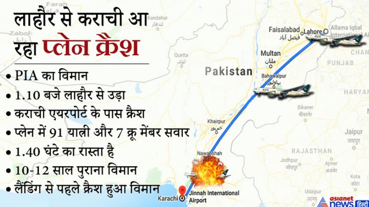 सिविल एविएशन अथॉरिटी के मुताबिक, पीआईए के विमान ने लाहौर से उड़ान भरी थी। लेकिन लैंडिंग से एक मिनट पहले ही विमान का संपर्क कंट्रौल रूम से कट गया। पाकिस्तानी मीडिया के मुताबिक, विमान कराची हवाई अड्डे के पास एक आवासीय कॉलोनी के नजदीक दुर्घनाग्रस्त हुआ।