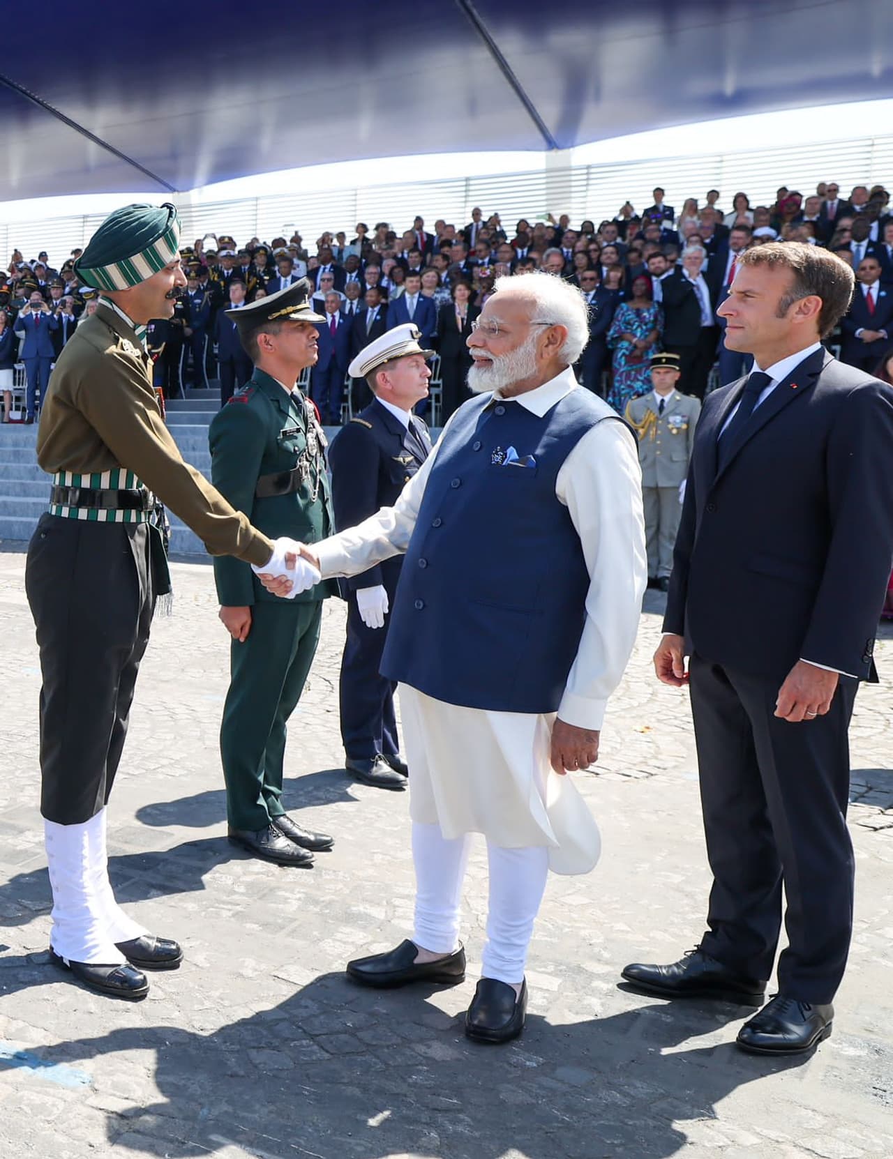 फ्रांस के नेशनल डे पर परेड में शामिल पीएम नरेंद्र मोदी ने भारतीय सेना के दस्ते की सलामी ली। फ्रांसीसी नेशनल डे पर भारतीय सेना के पंजाब रेजिमेंट का 77 मार्चिंग दस्ता और बैंड के 38 जवान भी शामिल हुए। सेना की टुकड़ी का नेतृत्व कैप्टन अमन जगताप, नौसैनिक दल को नेतृत्व कमांडर व्रत बघेल लीड ने किया। फ्रांस में इंडियन एयरफोर्स के दस्ते का नेतृत्व स्क्वाड्रन लीडर सिंधु रेड्डी ने किया।