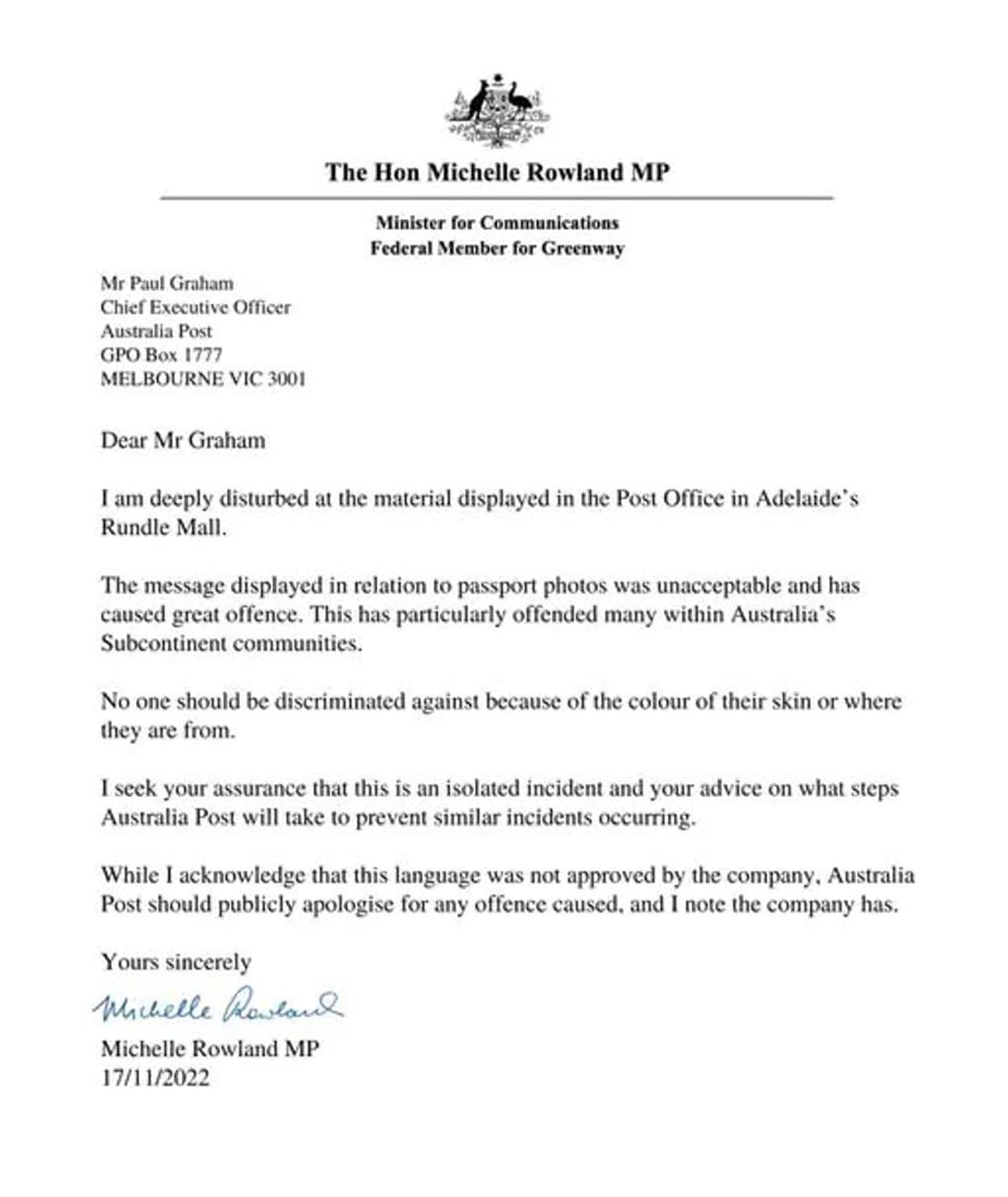 इससे पहले कि यह यह मामला अधिक तूल पकड़ता, ऑस्ट्रेलिया की टेलीकॉम मिनिस्टर और एनएसडब्ल्यू लेबर पार्टी की अध्यक्ष मिशेल रोलैंड ने कहा कि एडिलेड पोस्ट ऑफिस के बाहर साइन बोर्ड पर लिखी बातें स्वीकार नहीं की जा सकती हैं। उन्होंने ऑस्ट्रेलिया पोस्ट को लिखा है। जल्द ही वे अपडेट देंगी।