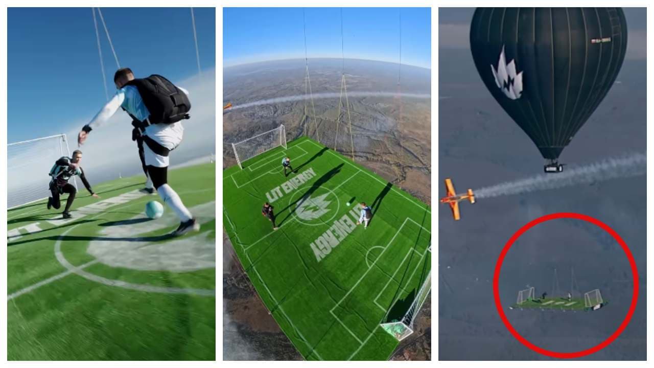 वीडियो में देखा जा सकता है कि जर्सी पहने खिलाड़ी पैराशूट बैकपैक के साथ एक बड़े गुब्बारे के नीचे लटकते प्लेटफॉर्म पर सावधानी से बॉल को किक कर रहे हैं। बादलों के ऊपर इस हिलते-डुलते प्लेटफॉर्म से बॉल को पास करना और किक करना फुटबॉल फैंस को काफी रोमांचित कर रहा था। इस शानदार नजारे को फिल्माने के लिए एक छोटा प्लेन भी गुब्बारे के ऊपर चक्कर लगाता हुआ दिखाई दे रहा है। यह प्लेन खुले आसमान के बीच हिलते-डुलते छोटे से खेल के मैदान के ड्रामैटिक एरियल शॉट्स लेने के लिए उड़ रहा है।