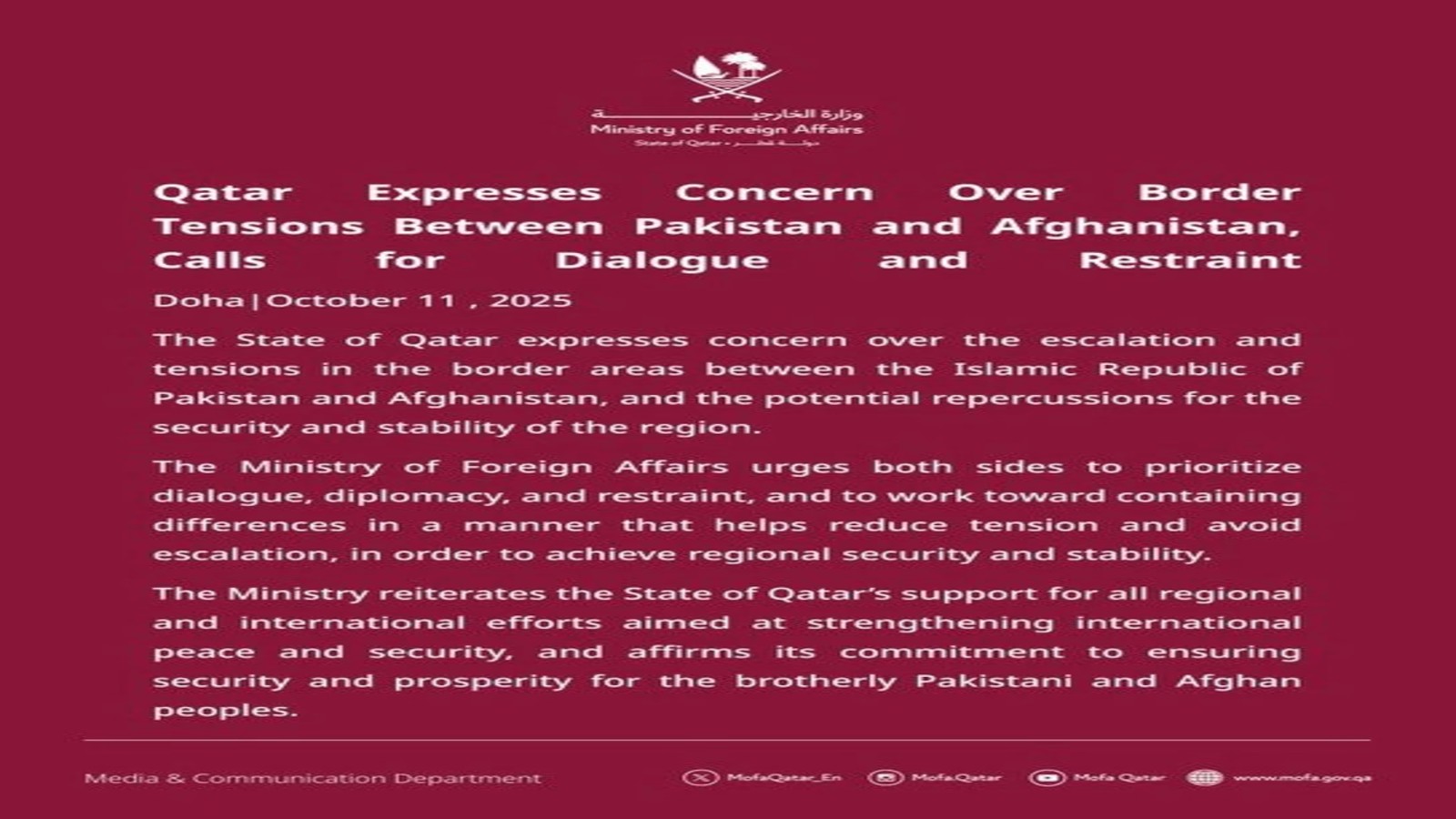 क़तर ने तुरंत दोनों देशों से संयम बरतने और बातचीत के ज़रिए मतभेद सुलझाने का आह्वान किया। विदेश मंत्रालय ने कहा कि सीमावर्ती क्षेत्रों में बढ़ते तनाव का न केवल क्षेत्रीय सुरक्षा पर असर पड़ेगा, बल्कि अंतर्राष्ट्रीय शांति के लिए भी खतरा हो सकता है। विशेषज्ञों का कहना है कि यदि दोनों पक्ष आपसी आरोप-प्रत्यारोप और हथियारबंद कार्रवाई जारी रखते हैं, तो यह सीमा विवाद नए और बड़े संकट की ओर बढ़ सकता है।