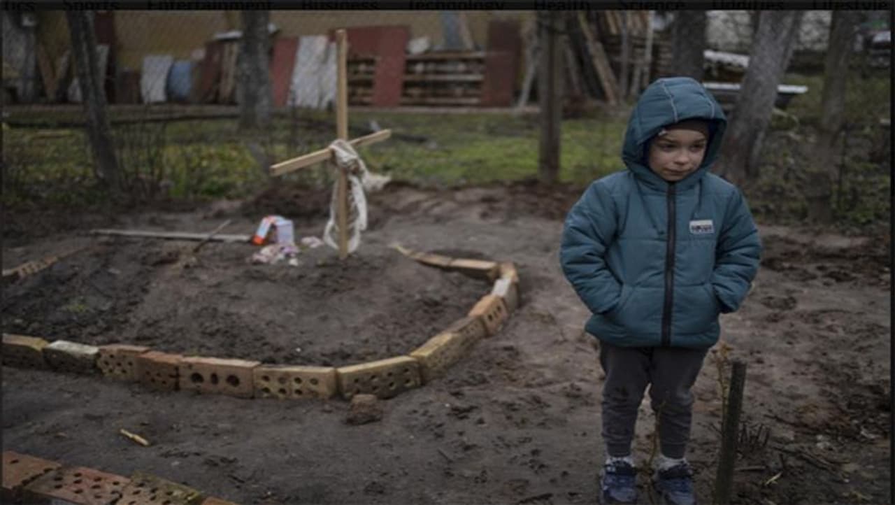 यह फोटो बुचा स्थित अपने घर के आंगन में अपनी मां की कब्र के पास खड़ा 6 साल के व्लाद का है। पिछले महीने नरसंहार के दौरान उसके परिवार को बेसमेंट में शरण के लिए मजबूर किया गया। इसी दौरान उसकी मां की मौत हो गई। परिवार को ये भी नहीं पता कि व्लाद की मां की मौत किस बीमारी से हुई। मां की मौत से बुरी तरह टूट चुका व्लाद अब दोस्तों के साथ कभी-कभी खेलने निकलता है। व्लाद उस बेसमेंट में भी जाता है, जहां बुचा नरसंहार के दौरान उसका परिवार छिपा था।